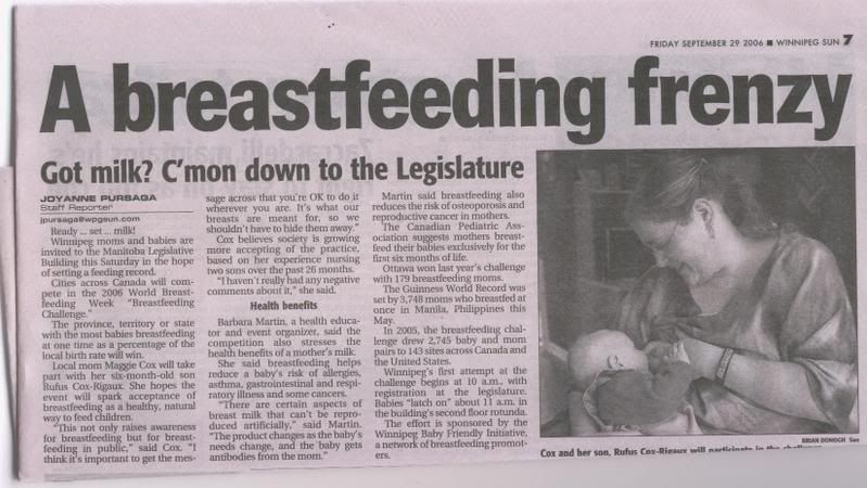 Rufus and I are about to take part in a Breastfeeding Challenge, along with Rufus' cousin Sophie and Aunty Kelly and many many other moms and babes. This Challenge is to help promote and raise awareness of Breastfeeding in the province, across the country and across the world. I am very excited about this challenge and got to share some of that excitement with the Winnipeg Sun and it's Readers. Here is the Article as well as a picture of Rufus having a midday snack. Also a pic of me & Ru as well as Aunty Kelly & Sophie taking part in the challenge.